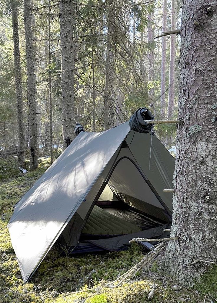 Tarp med sovdel, praktiskt sammankopplade för att snabbt och smidigt sättas upp i skog och mark. Nu är den äntligen här. I innertältdelen har du vindskydd längst ner på alla sidor och resten är myggnät för att slippa kondens.