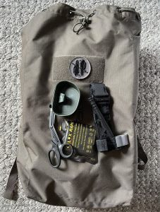 - Akutsjukvård: Tourniquet, tryckförband, sårpackning, hemostatiskt förband, vinylhandskar, Minneskort + AT-MIST, chest seal, sax.