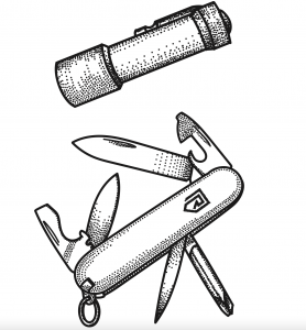 - Fällkniv, gärna en liten av schweizisk armémodell, med flask- och