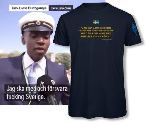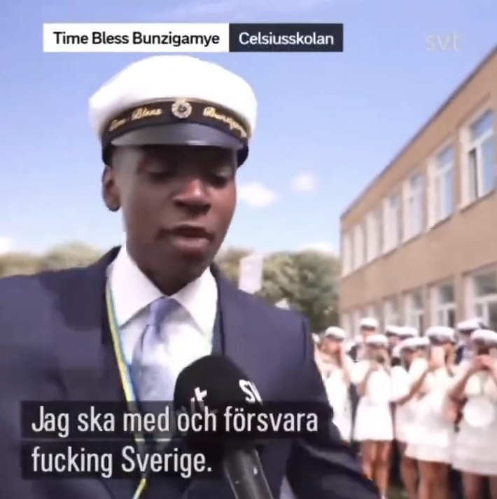 Time Bless Bunzigamye blev intervjuad av SVT och fick frågan om vad han skulle göra efter studenten. Han sade några bevingade ord: “Lumpen! Jag ska med och försvara fucking Sverige. Mitt fucking hemland! Kom igen nu! Nu kör vi!