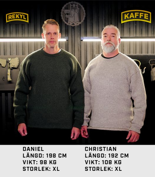 Islandströjan ska sitta löst och är stor i storlekarna. Poängen är ju att den ska binda mycket luft för att värma effektivt och isolera din överkropp mot kyla. På en av bilderna ser du Daniel och Christian i XL, de skulle även kunna bära storlek L. Men som vi poängterat. Meningen är att den ska sitta löst.
